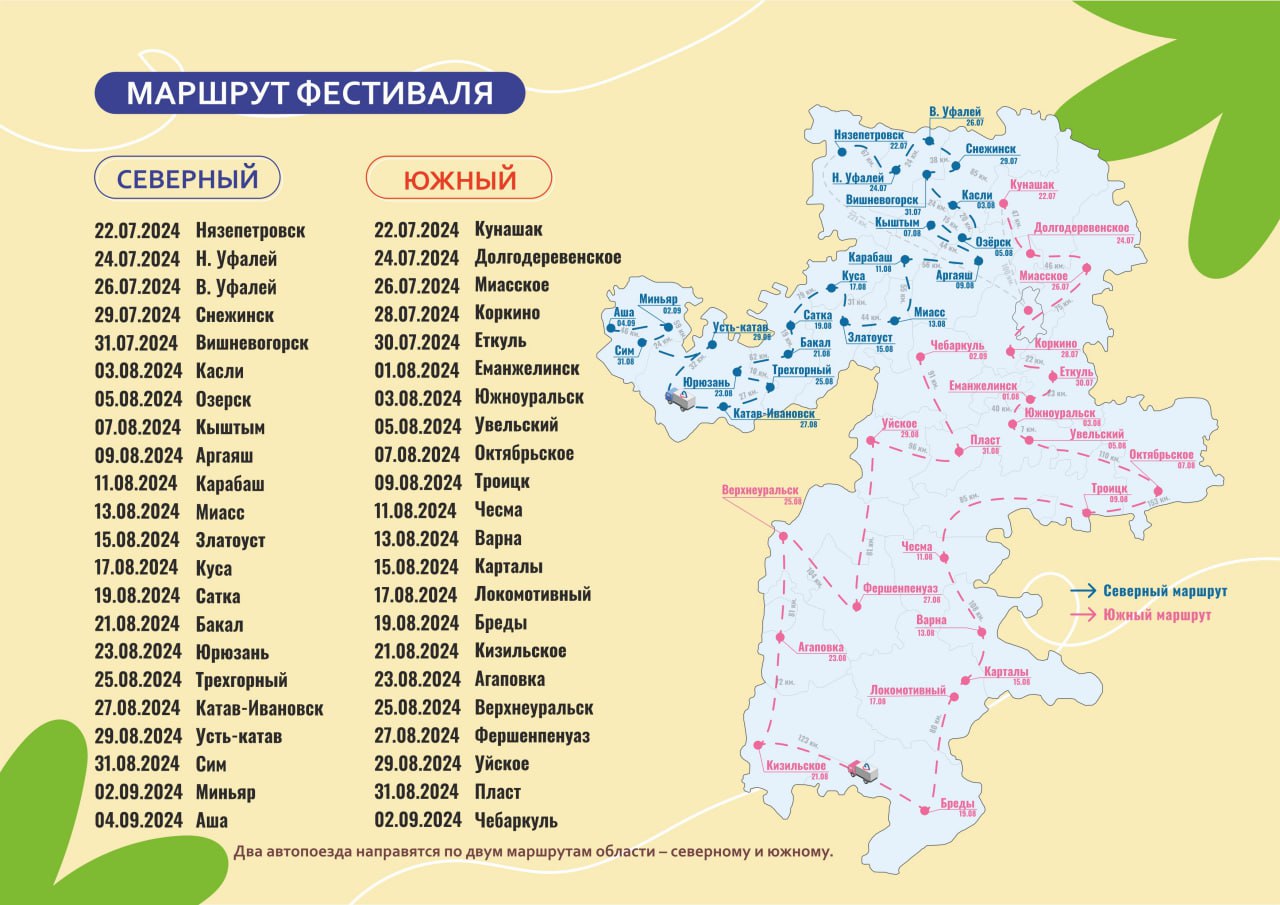 Путешествовать по региону команда проекта будет одновременно в двух направлениях – в северном и южном. В каждой из территорий летнего маршрута программа продлится с 12.00 до 20.00. Фестиваль стартует с 22 июля и первыми его примут Нязепетровск и Кунашак.