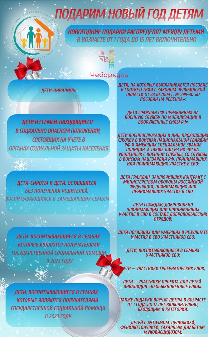 В соответствии с распоряжением Губернатора Челябинской области от 08.12.2023г. № 1431-р Новогодние подарки, полученные от Министерства социальных отношений, предназначены для следующих категорий детей, находящихся в трудной жизненной ситуации, в возрасте от 1 года до 16 лет (15 лет включительно):